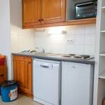 Coin cuisine : plaque électrique, micro-ondes, mini four, réfrigérateur, lave-vaisselle et tout le nécessaire de vaisselle