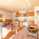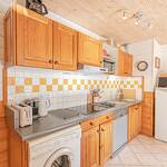 - Cuisine donnant sur le salon, équipée de plaque vitrocéramique, mini-four, lave-vaisselle, lave-linge, frigo avec compartiment congélateur, four micro-onde, cafetière électrique, grille-pain.