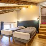 Gîte avec entrée indépendante : cuisine-salle à manger coin salon avec cheminée. 1 chambre (1 lit 2 personnes 160 x 200 cm + 1 lit 1 personne 90 x 190 cm en mezzanine) avec douche et lavabo. 1 salle de bain (baignoire) avec lave-linge et sèche-linge. 1 WC indépendant. Sur un demi-niveau : dortoir aménagé en 3 alcôves (2 lits 1 personne 90x200, 1 lit 1 personne 90x200) + 1 chambre (2 lit 1 personne 90x200). Terrasse privative agréablement ombragée avec vue panoramique sur les montagnes. Stationnement public dans le hameau.
